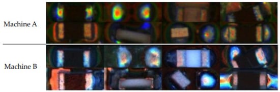 It is known that the images taken by different AOI machines will have the problem of distinct color scale differences. As shown in Figure 6, the images taken by A and B machines have obvious color scale differences. The AI model will have learning interference if the images are directly sent to the model for learning. Thus, before sending the images to the model for learning, the image pre-processing will be performed to help the model’s learning.