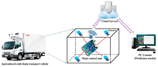 The main products transported in the cold chain were vegetables and other agricultural products. The transport route was from Guangzhou Baiyun to Guangzhou Haizhu. The dimensions of the box contained in the cold chain truck were 4075 × 2060 × 1860 (mm). In combination with the size of the cold chain truck and the location of the agricultural products, four hardware systems (i.e., four temperature collection sources and four humidity collection sources), designed for this study, were placed inside the boxes.