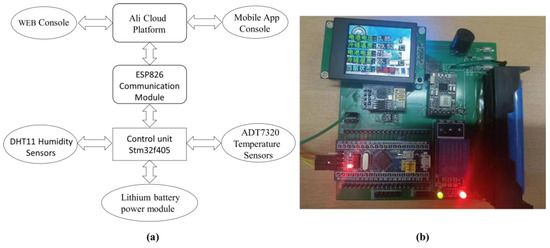 The overall block diagram of the hardware system is shown in Figure 2a. It mainly consists of the main control unit Stm32f405 module, a DHT11 sensor module, an ADT7320 temperature sensor module, an ESP8266 communication module and a Li-ion battery power supply module. In this study, the DHT11 is only responsible for collecting the humidity in the cold chain vehicle, and, to ensure the response time, the proposed system uses the ADT7320 temperature module as the temperature acquisition source for the cold chain vehicle. The ESP8266 communication module is responsible for realizing the data interaction between the main control unit and the cloud server. The lithium battery power supply module is responsible for providing the driving voltage (3.3 V) required by the main control unit and the previous modules to ensure the normal operation of the hardware system in the cold chain vehicle. A picture of the employed hardware system to implement the idea is shown in Figure 2b.