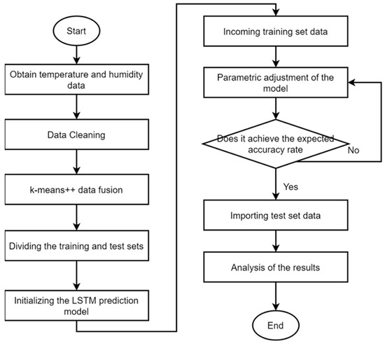 This experiment constructed a k-means++-based LSTM prediction model. It is based on the idea of the fusion of temperature and humidity data using the k-means++ algorithm. The LSTM prediction model was later used to predict future temperature and humidity data. Experiments have proven that this can effectively improve prediction accuracy. The prediction process is shown in Figure 5.