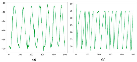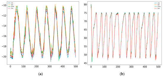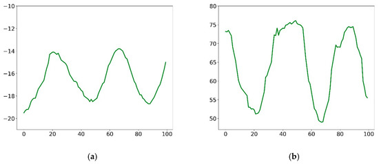 The k-means++ algorithm performs clustering based on the Euclidean distance of the data from the initial points. It is characterized by its high computational speed and efficiency. The algorithm abandons the k-means random selection of clustering centers. The fused data are shown in Figure 7a,b. This data fusion improved the accuracy to a certain extent and presented a more accurate periodicity. In this paper, we used the fused temperature and humidity time series representation. Thus, the input time series samples were constructed.