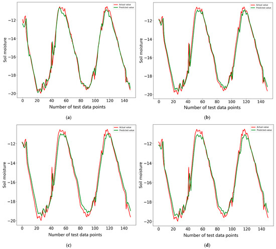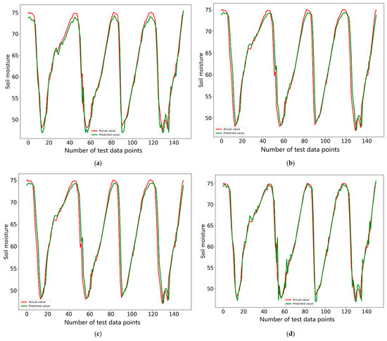 Figure 9 represents the trend of the predicted and actual values of humidity for the four groups of the LSTM neural network. The main errors occurred where the data set fluctuates considerably.