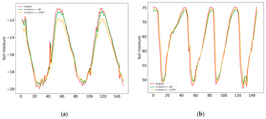 Figure 9. Prediction curves for k-means++ and LSTM humidity models: (a) Experiment 1 prediction curve; (b) Experiment 2 prediction curve; (c) Experiment 3 prediction curve; (d) Experiment 4 prediction curve.