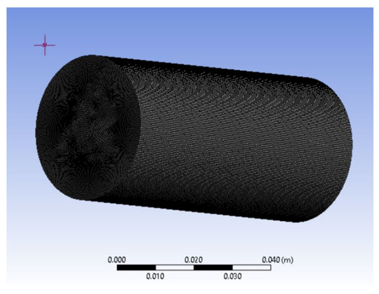 Computational fluid dynamics (CFD) simulations are performed using the commercial code, ANSYS Fluent 18.2 [38]. Transient multiphase flow simulations are performed. Initially, the core sample is filled with water. Carbon dioxide is injected through the inlet at a given inlet pressure. The permeability and the resistance loss coefficient used in the simulations are 1 × 10−12 m2 and 1 × 10−12 m−1, respectively, as these values are representative of typical drainage experiments [39]. The laminar flow model is used. The relative permeability of carbon dioxide is calculated every second. The volume of fluid (VOF) multiphase flow model is used. This model is typically used when two or more immiscible fluids are modeled. In addition, the model is useful towards tracking any liquid–gas interface in steady or transient CFD simulations [38]. To solve the transient problem, the mass and momentum conservation equations are solved as shown by Equations (3) and (4), respectively. The interface between the phases is tracked using the solution of the mass conservation equation as shown by Equation (3):