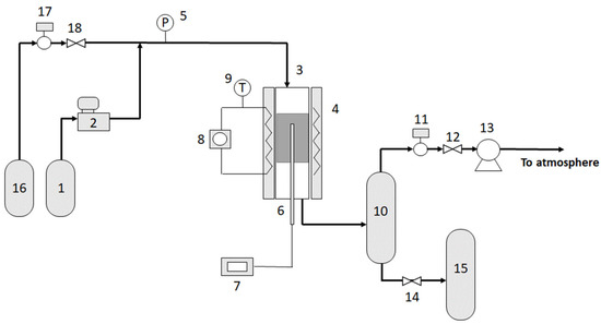 1—Ethyl acetate reservoir; 2—Hydrogen bottle; 3—Pump; 4—Pressure gauge; 5—Valves; 6—Pressure reducer; 7—Non-return valve; 8—Tubular reactor; 9—Heating furnace; 10–11—Thermocouples and thermoregulators; 12—Liquid condenser; 13—Liquid product container; 14—Valve; 15,16—Valves; 17—Gas Chromatograph;18—Hydrogen to the vent. See Ref. [69].