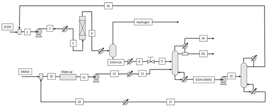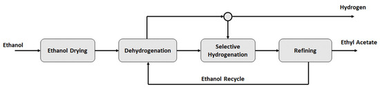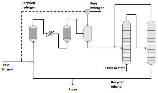 Scheme of an industrial plant of ethanol dehydrogenation to ethyl acetate. Plant capacity was calibrated for producing 1665 tons/year of hydrogen with an ethanol feed of 38,700 tons/year. Re-elaborated from [16] and reported with the permission of Elsevier.