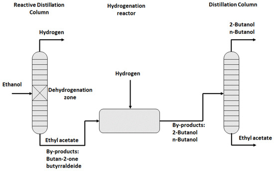 As mentioned before, an industrial process has been realized and commercialized by Davy Company in South Africa some years ago. The catalyst used by Davy for the ethanol dehydrogenation was a commercial copper chromite catalyst. A simplified scheme of their proposed plant is the one reported in Figure 5 taken from their private communication [43].