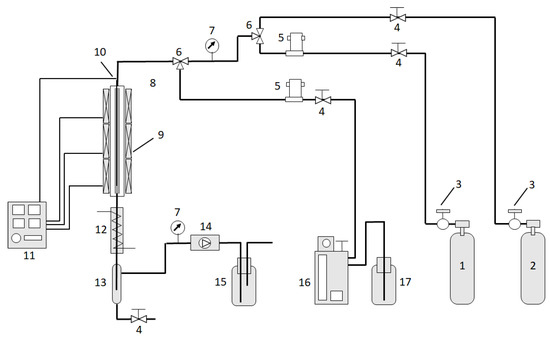 Fixed-bed reaction system. 1—H2; 2—N2; 3—Reducing valve; 4—Valve; 5—Mass flow meter; 6—Three way valve; 7—Pressure gauge; 8—Reactor; 9—Heater; 10—Thermocouple; 11—Temperature controller; 12—Condenser; 13—Gas-liquid separator; 14—Back pressure valve; 15—Gas washing bottle; 16—Micro syringe pump; 17—Raw materials. See ref. [31]. Reported with the permission of Elsevier.