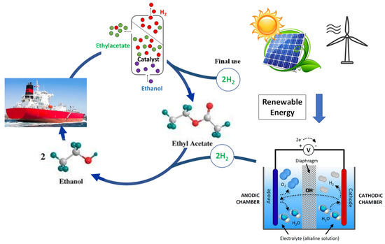 “Green” electricity provided by renewable sources of energy such as photovoltaic plants, wind turbines, hydroelectric plants, geothermal energy plants, and energy from biomass can be used within an electrolysis process to produce gaseous hydrogen from water. However, when the renewable sources of energy are in places where the energy demand is low, it is opportune to store the excess of produced energy. This can be done by producing hydrogen and storing it inside a LOHC through a hydrogenation reaction. The hydrogenated molecule must allow long-term storage, must be suitable for long-distance transport and must be ready, at the time of need, to unload hydrogen after the transport and storage in a place where the energy demand is high. Many different LOHC substances have been proposed until now such as: methylcyclohexane, 12H-N-ethylcarbazole, 18H dibenzyl toluene, naphthalene and others. The use of a LOHC is based on a two steps cycle: (i) loading hydrogen into the LOHC molecule through hydrogenation; (ii) recovering hydrogen through dehydrogenation. Normally, hydrogenation is an exothermic process, and the reaction heat can be used to keep the reaction pressure and temperature at the desired level. In contrast, dehydrogenation is an endothermic process occurring at low pressure and high temperatures. The hydrogen released by dehydrogenation requires, therefore, heat from an appropriate heat source to drive the dehydrogenation process. This occurs when LOHCs are molecules containing aromatic rings. The heat necessary during dehydrogenation can be furnished by burning part of the hydrogen produced, so reducing the efficiency of the overall process, or alternatively by building the plant near a waste heat source. Let us consider, for this purpose, the LOHC system methylcyclohexane-toluene as a reference for comparison [72]. The use of bioethanol as LOHC allows storing of 4.3% by weight of hydrogen, which means storage of 34 kg of H2/m3 of ethanol or, alternatively, 1.35 kWh/L of ethanol. Bioethanol is a free-flowing liquid that has the advantage of being non-toxic, renewable, biodegradable, and largely available as raw material at a lower and lower cost. Bioethanol is, therefore, a good LOHC candidate for the application of green energy storage according to the cycle of Figure 11.