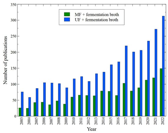 In the literature, there is general agreement that in order to maintain high NF processing performance and ensure the long-term stability of membrane systems, fouling controlling is required. For this purpose, the major employed strategies are manufacturing membranes with good antifouling abilities [26,27], as well as feed pretreatment [28], which can be achieved by pressure-driven membrane transport processes, namely, microfiltration (MF) and ultrafiltration (UF). The selectivity of the above-mentioned technologies is dominated by a sieving effect. They have the potential to replace conventional processes, such as centrifugation, which is high-power demanding and expensive. Generally, MF membranes are characterized by pore diameters of 0.1–5 μm. They would potentially remove suspended solids, macromolecular organics, colloidal particles and bacteria. In turn, UF membranes have pore sizes in the range between 0.01 and 0.04 μm. Comparing to MF, the UF process allows separating other molecules, such as carbohydrates, as well as large and small microorganisms. Moreover, the UF process requires higher operating pressures, and UF membranes are more expensive than those used for the MF process [29]. It has been documented that MF and UF membranes can be successfully used for the pretreatment of various media, for instance, raw seawater [30,31,32], as well as oily [33,34] and laundry [35,36] wastewaters. Moreover, in the recent decade, many researchers have made remarkable achievements in the application of MF processes, e.g., [29,37,38,39,40,41,42], and UF processes, e.g., [29,41,43,44,45,46], for purification of fermentation broths. This finding is confirmed by data presented in Figure 1, which clearly demonstrates the noticeable increase in the number of articles published on this issue during the last two decades. To sum up, it should be highlighted that the choice of the most suitable pretreatment process is a great challenge since it depends mainly on specific requirements for the removal of contaminants [47].