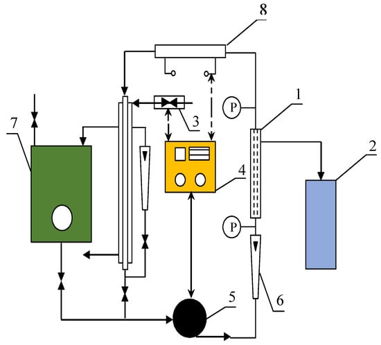 Experimental set-up of the cross-flow filtration unit. 1—MF module, 2—measuring cylinder, 3—heat exchanger, 4—controller of temperature and flow rate, 5—pump, 6—rotameter, 7—feed tank, 8—heater and P—manometer.
