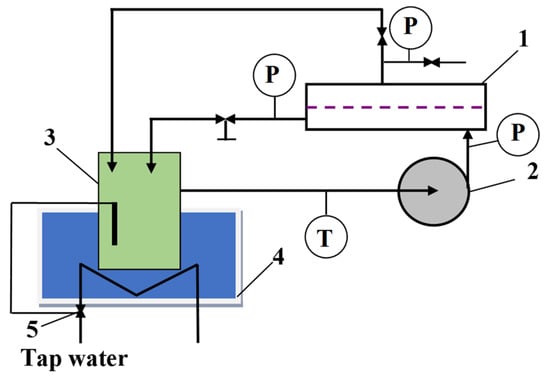 Experimental NF set-up. 1—SEPA-CFII module, 2—pump, 3—feed tank, 4–cooling bath, 5—thermostatic Grundfos valve, P—manometer and T—thermometer.