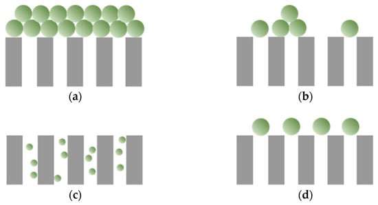 where t is the filtration process time; V is the permeate volume; k is constant; and n is the characteristic exponent depending on the fouling mechanism, which includes: cake formation (n = 0), intermediate blocking (n = 1.0), standard blocking (n = 1.5) and complete blocking (n = 2.0). From the literature mentioned earlier, the characteristics of the above-mentioned mechanisms are as follows. (i) Cake formation (Figure 4a): the solutes’ diameter is larger than the membrane pores’ size, they deposit on the particles that already block the pores, and as a result, a cake layer is formed on the membrane surface. (ii) Intermediate blocking (Figure 4b): a single particle can precipitate on other particles to form multi-layers. (iii) Standard blocking (Figure 4c): particles are adsorbed and deposited on the internal pore wall, constricting the pore volume. (iv) Complete blocking (Figure 4d): the foulant’s size is similar to the size of the membrane pores, and consequently, the number of open pores is reduced.