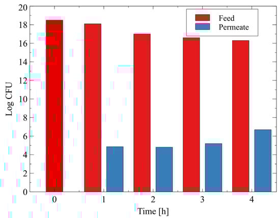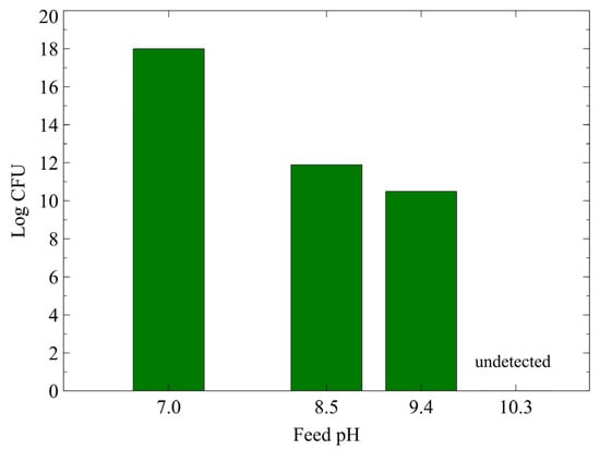 Clarification of the feed containing bacteria can cause their development in different parts of the membrane installation. Hence, to gain further insight, in the next stage of experimental research, the effectiveness of the bacteria removal with the use of sodium hydroxide (NaOH) solution was investigated. In the present study, NaOH solution was gradually added to the broth (pH = 7), and after 30 min of feed circulation, the number of bacteria was determined. As expected, the addition of NaOH solution led to a decrease in the number of bacteria present in the feed (Figure 6). Indeed, at feed pH equal to 7, 8.5 and 9.4, the log CFU was equal to 12.69, 11.90 and 10.50, respectively. Finally, after 30 min of feed (pH ≥ 10.3) recirculation, no bacteria were detected. Undoubtedly, the obtained results highlight the efficiency of NaOH in providing a sterile filtration system.