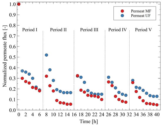 Figure 7 shows changes in the normalized permeate flux during the long-term NF processes performed for MF and UF permeates. Each of the NF processes was divided into five several-hour stages. After each, the membrane was rinsed with distilled water, and the process was restarted. It can be clearly seen that for both solutions, the permeate flux decreased significantly during the first hours of the process run. Indeed, after 60 min, the normalized flux of 0.30 and 0.37 was noted for the MF and UF permeates, respectively. Subsequently, the flux systematically decreased. After 6 h, the flux corresponded to 0.18 and 0.19 of its initial value for the MF and UF permeates, respectively. Undoubtedly, the obtained reduction in membrane performance was caused by the fouling phenomenon. This observation is in line with results reported in the literature. Indeed, the decrease in the NF membrane performance during the separation of fermentation broths was presented in several others studies [10,11,13]. Further investigations into the membrane performance (Figure 7, periods II-V) confirmed the low values of the normalized permeate flux. However, it should be pointed out that for each phase analyzed, the flux for the UF permeate was higher than that for the MF permeate. More specifically, the normalized flux for the UF permeate was higher by several percentage points. This observation clearly showed that the feed pretreatment process has a significant impact on the NF permeate flux. The reported difference may be attributed to different fouling mechanisms influencing the permeate decline.