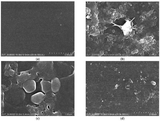 It is noteworthy that after the process using the broth pretreated by the UF process as a feed, the membrane color was much brighter than that shown in Figure 8, and no characteristic grid lines were visible. Indeed, the amount of deposit formed on the membrane surface was lower. Moreover, no bacteria were visible, and inorganic agglomerates were formed locally (Figure 9d). It is in agreement with findings presented earlier, which demonstrated that during the first stage of the NF process of the UF permeate, standard blocking was the dominant fouling mechanism.