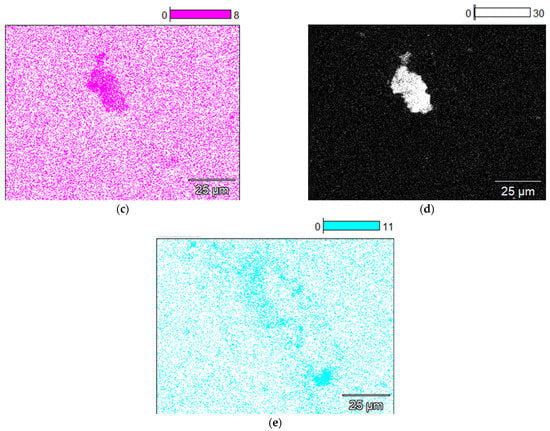 SEM-EDX analysis (elements mapping) of deposit formed on the NF membrane surface during the separation of UF permeate: (a) O; (b) Mg; (c) Al; (d) Si; (e) Fe.