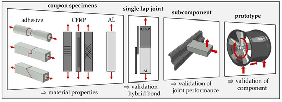Figure 1 shows the test program for the hybrid joint development for the research. Material properties for the simulation models are evaluated using coupon specimens [20,21]; the hybrid bond is validated on single lap joints [22]. Tests on subcomponent specimens first give experimental joint validation, and tests on wheel prototypes give validation on a component level.