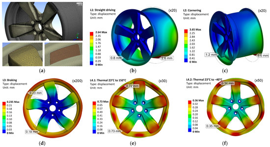 Simulation of the hybrid wheel in different load cases: (a) finite element model of wheel and joint with adhesive layer; (b) wheel displacement during L1: straight driving; (c) displacement during L2: cornering; (d) displacement during L3: braking; (e) displacement during L4.1: thermal load case 23 to 150 °C; (f) displacement during L4.2: thermal load case 23 to −40 °C.