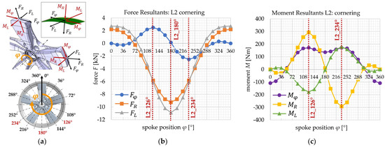 An exemplary evaluation of the force and moment resultants over the 360° wheel rollover for the load case “L2: cornering” is shown in Figure 3b,c. The graphical course shows maxima and minima in different spoke positions. Extreme radial and lateral forces occur at 180° spoke position, with extreme circumferential forces as well as all extreme moment resultants at 126° and 234° spoke position.