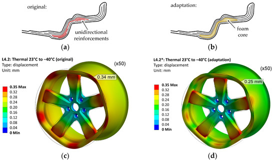 Figure 4c,d show the changes in deformation behavior between the original and the adapted design for the load case “L4.2: Thermal 23 to −40 °C”. In both variations, the shrinkage of the aluminum disc due to the temperature drop is similar. The deviation of the composite rim to its undeformed shape, on the other hand, is less pronounced in the adapted variation, with only a 0.25 mm deviation between the spokes, compared to 0.35 mm in the original design.