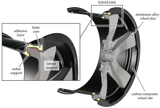 Hybrid automotive wheels, consisting of a carbon composite (CFRP) wheel rim and an aluminum alloy wheel disc, have been state of the art for several years, offering a lightweight potential of 15 to 20% compared to monolithic aluminum wheels [1,2,3,4]. The large wheel rim represents the greatest portion of the wheel. Therefore, its composite design effectively reduces the rotational mass and improves the damping behavior of the wheel. In addition, the cylindrical geometry enables more efficient manufacturing processes such as braiding [5] and resin transfer molding [6,7], offering advantages regarding mass production compared to full composite wheels. The wheel disc with its complex spoke design, on the other hand, is best realized in metal manufacturing processes such as casting or forging [8], with high strength and fatigue values and precise processing of the hub intersection. The joint between the two parts is conventionally realized as a bolted joint [9,10], due to the high structural and thermal loads. However, the realization of bolted joints is complex. Milling processes of the composite part and integration of threaded holes in the aluminum disc are necessary, as well as sealing measures. In addition, the bolted joint usually needs to be combined with a form-fitted sleeve design as resistance against the high resulting shear loads. These additional mechanical elements lead to compromises in lightweight design.
