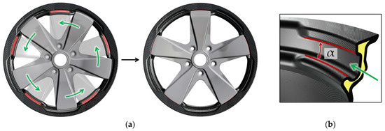 The analysis of the joint requirements shows that critical radial force resultants occur in the thermal load cases due to the different thermal expansion rates of the aluminum wheel disc and the composite wheel rim. In the case of the composite rim, the thermal expansion rate as well as the rim stiffness result from the fiber layup and therefore offer the potential of more convenient design adaptations. In the original rim design (Figure 4a), unidirectional reinforcements are inserted in the rim flange areas with the objective of increasing the rim stiffness in the circumferential direction, as well as realizing thicker areas with a specific surface geometry. However, the reinforcements are primarily necessary for the in-board flange side. On the out-board side, the aluminum wheel disc increases the rim stiffness. This allows for the replacement of the unidirectional reinforcements with foam core segments (Figure 4b), while still achieving sufficient strength and stiffness of the rim flange. This sandwich design leads to a more flexible behavior of the rim flange in circumferential directing, as well as to a reduction of the difference in thermal expansion between the composite and aluminum components.