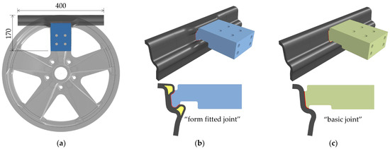 The aluminum adherend is made from a forged aluminum alloy within a milling and drilling process. For the adhesive bonding process, a mounting tool is realized, as shown in Figure 9c. Here, the adherends are joined in a similar bonding direction as planned for the wheel joint, creating contact pressure via the wedge-shaped form of the interfaces. For the curing process of the adhesive, the assembly is exposed to 180 °C for 30 min. Figure 10 shows the finished subcomponent specimens in variations such as “basic joint” and “form-fitted joint”.