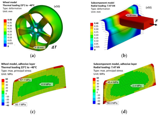 The comparative evaluation of the maximum principal stress in the adhesive layer for the exemplary radial load case is shown in Figure 8c,d. In both models, the adhesive area and thickness are similar. However, the simplified linear layout, as well as the difference in stiffness of the aluminum adherend, lead to a slightly different stress state in the subcomponent model, with more pronounced stresses up to 58.0 MPa at the bottom corners and less pronounced stresses of 2.4 MPa in the center. Still, the deviations are considered acceptable for the objective of first experimental validation with subcomponents. More realistic validations can be generated by tests on wheel prototypes after a detailed design stage.