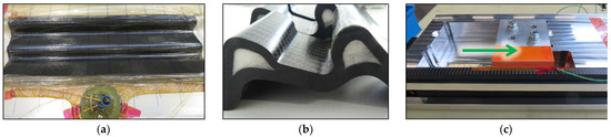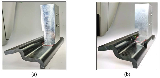 The manufacturing of subcomponent specimens is performed in several different steps. The composite adherend is realized via a vacuum infusion process. Therefore, the dry layup, including the woven fabrics and the foam core segments, is placed into a mold and sealed with a vacuum bag, as shown in Figure 9a. The resin is then infused into the mold cavity by a vacuum pump. For the curing process of the resin, the specimens are placed in an oven at 120 °C for 40 min and then at 190 °C for 2 h. In Figure 9b, a cross-sectional cut of the “form-fitted” composite adherend with its foam core is shown.