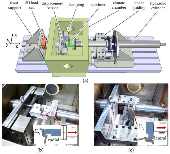 The specimens can be mounted in two different orientations, as shown in Figure 11b,c. In the first orientation, the load can be introduced in the radial direction of the joint; in the second orientation, the load is introduced in the lateral direction.