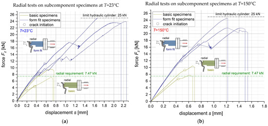 The test results of the radial load case are shown in Figure 12a for 23 °C and Figure 12b for 150 °C. For both temperatures, the results show significant improvement of the maximum bearable force of the “form-fitted joint” compared to the “basic joint”. The crack initiation of the “form-fitted joint” occurs after the required radial load of 7.47 kN (Table 4), while the “basic joint” does not meet the requirement.