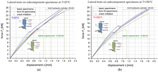 Force–displacement curves of lateral tests on “basic” and “form-fitted” subcomponent specimens at (a) 23°C; (b) 150°C.