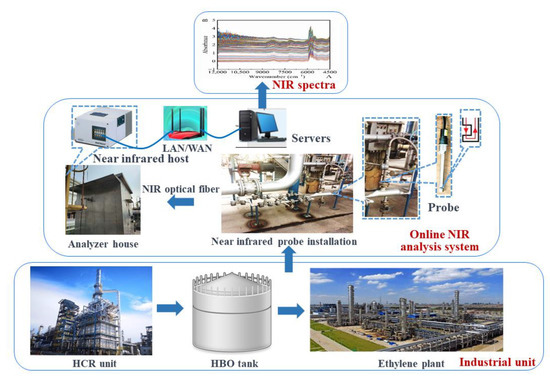 The HBO sampling site and the online method for measuring the NIR spectra of the HBO samples are shown in Figure 1. An online NIR Fourier transform spectrometer (Bruker, Germany), equipped with a tungsten halogen lamp, was used to online collect NIR spectra. A liquid immersion fiber optic probe with a 1.0 mm optical path length was installed on the feeding pipeline before the cracking furnace. The probe was connected to a spectrometer via a 50 m fiber optics cable. When the spectrometer and illumination are properly installed, this transmission mode of the NIR probe could collect more information about the HBO samples, as the light can penetrate through them. It can be used for a comprehensive assessment of the quality of HBO if satisfactory spectral information can be obtained and processed. The NIR spectra were scanned within the wavelength range of 4500 cm−1–12,000 cm−1. During a 1 h HBO sampling period, 30 NIR spectra of the HBO sample were recorded at 2 min intervals. Each spectrum consisted of 32 accumulation scans, resulting in over 4000 spectra collected in total. The NIR spectrum of a sample used for modeling was constructed by taking the average of the 30 spectra, ensuring spectral reproducibility.