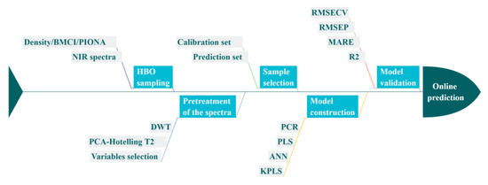 The flow chart illustrating how the methods predict the properties of HBO rapidly through transmission NIR spectroscopy is shown in Figure 2. The same sample sets and the same characteristic wavelength ranges of NIR spectroscopy were used to construct NIR prediction modes via PCR, PLS, ANN, and KPLS.