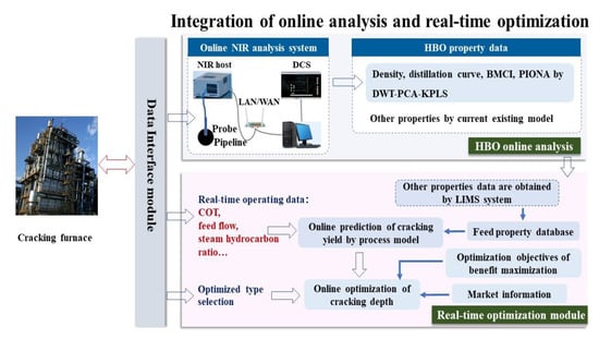 A real-time optimization system was constructed to optimize the 360,000 t/year HBO ethylene cracker. The system had several functions, including optimization mode selection and setting, monitoring of cracking feed data, selection of operating conditions and setting of constraint ranges, results display of cracking depth optimization and dilution ratio (stream to feed ratio), and system status verification. The real-time optimization framework of ethylene cracking process is shown in Figure 3. It was composed of an online NIR detection system for HBO and a real-time optimization module for the ethylene cracking process. Every module constructed a security policy to ensure the safety and stability of the system.
