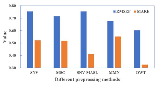 As shown in Figure 4, the and values of all pretreatment methods were lower than 0.8 and 0.6, respectively. The value of SNV-MASL was the highest, while the value was relatively small. The RMSEP value of MMN was relatively small but the MARE value was particularly high. SNV and MSC had similar effects. Among the five methods, and values of DWT were the smallest; considering and comprehensively, the effect of DWT was best compared with other methods. Thus, DWT was chosen as the method for the pretreatment of NIR spectral data.