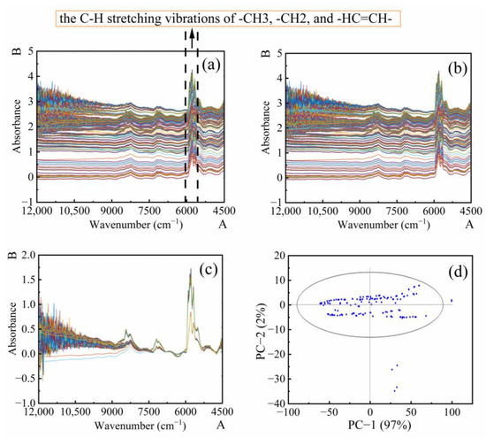 NIR spectra of HBO samples within the range of 12,000 cm−1–4500 cm−1. (a) Raw NIR spectral data. (b) Spectra denoised by DWT. (c) Spectra after baseline correction. (d) Score plot from the PCA of the NIR spectra of the HBO samples.