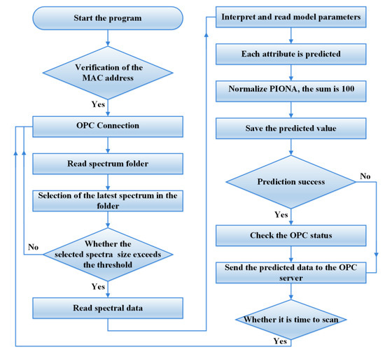 Near infrared (NIR) spectroscopy has been proven to be highly valuable in predicting product quality as it can obtain information about multiple kinds of chemical bonds (e.g., C–H, O–H, or N–H) in molecules [11]. Thus, the application of this technique in the online detection of sample quality has received increasing attention due to its speed, low cost, and minimal sample preparation requirements [12,13,14]. It is extensively employed for predicting qualitative and quantitative properties of the products in various industries, such as agricultural, food, and pharmaceutical industries [15]. Optimal models on the basis of NIR spectroscopy have been developed to predict the quality of various types of materials, such as biorefinery feedstocks [16], tomatoes, and alternative fuels [17].