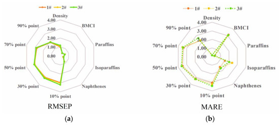 The results of the application of the KPLS model to the NIR spectral data of the HBO samples in the prediction subset are provided in Figure 7. The density, , PIONA content, 10% point, 30% point, 50% point, 70% point, and 90% point of the HBO samples measured by the standard test method were compared. Among them, the highest R2 value was for the 10% point, the second highest R2 value was for paraffins, and the smallest R2 value was for the 90% point, the corresponding value was 0.877. The smallest was for isoparaffins, the next smallest was the , and the highest value was for the 10% point, and the corresponding value was 2.150. The smallest value was for density, and the next smallest value was for paraffins; the highest value was for the 70% point, and the corresponding value was 2.854. The result of the three values of paraffins was relatively good compared to the results of other properties. The and values of the models were less than 3 and their exceeded 0.87. The low and values for these properties confirmed the models’ prediction performance.