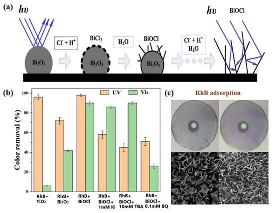 - Li, K.; Tang, Y.; Xu, Y.; Wang, Y.; Huo, Y.; Li, H.; Jia, J. A BiOCl film synthesis from Bi2O3 film and its UV and visible light photocatalytic activity. Appl. Catal. B Environ. 2013, 140–141, 179–188. [Google Scholar] [CrossRef]