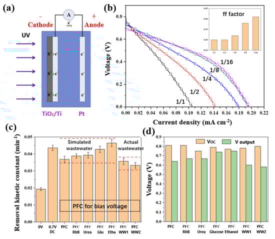 - Li, K.; Zhang, H.; Tang, T.; Xu, Y.; Ying, D.; Wang, Y.; Jia, J. Optimization and application of TiO2/Ti-Pt photo fuel cell (PFC) to effectively generate electricity and degrade organic pollutants simultaneously. Water Res. 2014, 62, 1–10. [Google Scholar] [CrossRef]