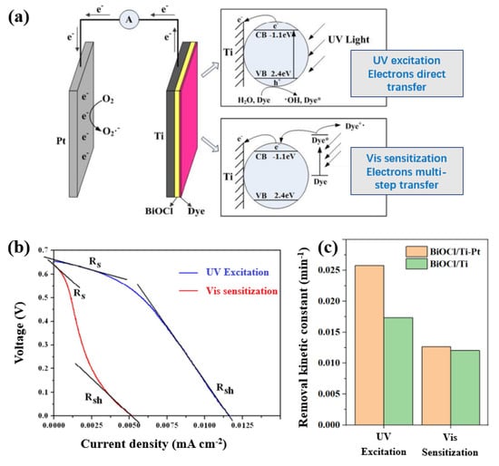 - Li, K.; Xu, Y.; He, Y.; Yang, C.; Wang, Y.; Jia, J. Photocatalytic Fuel Cell (PFC) and Dye Self-Photosensitization Photocatalytic Fuel Cell (DSPFC) with BiOCl/Ti Photoanode under UV and Visible Light Irradiation. Environ. Sci. Technol. 2013, 47, 3490–3497. [Google Scholar] [CrossRef]