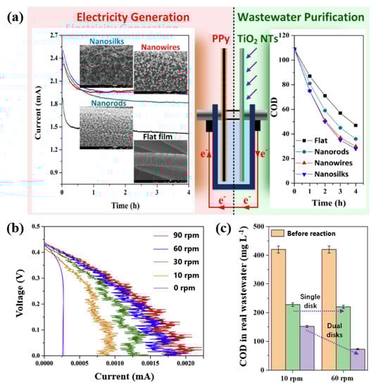 - Li, K.; Zhang, H.; Ma, Y.; Sun, T.; Jia, J. Nanostructured polypyrrole cathode based dual rotating disk photo fuel cell for textile wastewater purification and electricity generation. Electrochim. Acta 2019, 303, 329–340. [Google Scholar] [CrossRef]