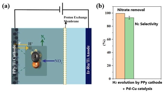 - Chen, C.; Li, K.; Li, C.; Sun, T.; Jia, J. Combination of Pd-Cu Catalysis and Electrolytic H2 Evolution for Selective Nitrate Reduction Using Protonated Polypyrrole as a Cathode. Environ. Sci. Technol. 2019, 53, 13868–13877. [Google Scholar] [CrossRef]