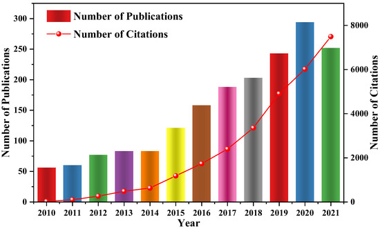Literature retrieval strategies and methods greatly affect the accuracy of the scientometric analysis. Considering that imbibition mainly occurs in shale, tight reservoirs, hydrates, and typical porous media, the exploitation of extraordinary oil and gas resources has achieved rapid development in the past 10 years. Therefore, the search keywords were finally determined (as shale and imbibition, or tight reservoir and imbibition, or hydrate and imbibition, or porous media and imbibition), where the language, document type, and period are set as “English”, “Thesis”, “Article and Review”, and “2010–2021” (about 10 years, search date was 27 November 2021). Based on this search strategy, a total of 1810 papers were retrieved and exported.