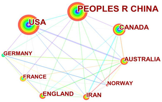 Figure 4 is a map of the national cooperation network for imbibition research in unconventional reservoirs. According to the size of the nodes in the map, the leading countries in this field can be identified. The five countries with the largest number of publications are China (688 papers), the United States (560 papers), Canada (182 papers), Australia (119 papers), and Iran (104 papers). A large number of published papers show that these countries have made different degrees of progress in research in this field, and have made outstanding contributions to imbibition research in unconventional reservoirs. Especially in the past 10 years, Chinese scholars have published a large number of valuable papers, making the most outstanding contribution to the exploitation of oil and gas. In terms of international cooperation, researchers from China, the United States, and Canada, as well as other countries, work closely with each other and publish a large number of influential articles.