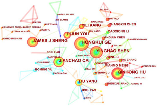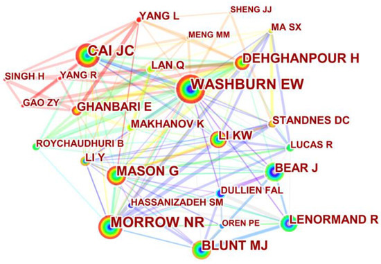 The collaborative network of lead authors for imbibition research in unconventional reservoirs is shown in Figure 6. The author’s cooperative relationship and influence can be analyzed according to the size of the nodes in the network. The top four authors with the most publications are Hongkui Ge (35 papers), Qinhong Hu (34 papers), Dehghanpou H (33 papers), and JC Cai (32 papers). In addition, authors with larger nodes in Figure 6 are often central authors in the collaborative network and have collaborative relationships with many scholars who have the same research direction. The shale reservoirs in the Sichuan Basin and the tight sandstone reservoirs in the Ordos Basin are quite different in porosity and other parameters. The tight volcanic rocks in the Songliao Basin have obvious anisotropic characteristics. The above three sites are rich in oil and gas reserves, and the imbibition efficiency of the reservoirs in each area can be compared during the imbibition test. [20]. Porous materials such as shale have complex geometries and topologies, which limit the interaction of media in fractures during hydraulic fracturing. The low pore connectivity of shale matrices needs to be studied by combining experimental and theoretical methods [21]. There are three main fluid flow mechanisms in shale formations, and gas transport models in shale can be established according to the fractal media in the flow process. The change in liquid flux caused by surface diffusion during imbibition decreases with heat and increases significantly with imbibition capacity [22].