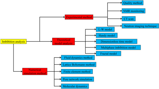 The keyword “porous media” is the most common keyword that has appeared in the past 10 years. The unconventional reservoirs in the actual production process are mostly porous media such as shale sandstone. Therefore, the rational study of imbibition in porous media is an important condition to ensure the efficient development of shale gas. Researchers have proposed various research methods for imbibition. They can be grouped into three categories, including experimental methods, theoretical model analysis, and the numerical simulation method, the specific methods of different categories are shown in Figure 8. In addition, the frequent occurrence of the keyword “water” indicates that the study of water saturation in the reservoir is a hotspot. Confined gas and self-priming fluid imbibition processes outside tight sandstone, volcanic, and shale reservoirs are different. The saturation of imbibed fluid changes with the change of medium during hydraulic fracturing of unconventional reservoirs [20]. Imbibition experiments for various fluids and media are carried out for shale samples from the Horn River Basin. The slopes of the imbibition curves of rock samples with different saturations are quite different, which can be explained by the electrostatic interaction theory [24]. Specific three-phase flooding experiments on rocks can be used to study the saturation of different rock samples. In the whole experiment, the water absorption in the rock samples was fixedly controlled, and no external pressure was applied. Through the measurement and analysis of saturation data, the influence of steady-state water inflow and time-varying saturation is obtained [25].