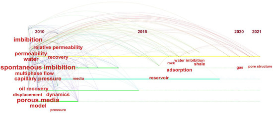 Since only the frequency of occurrence is considered in the concurrent network diagram of keywords in Figure 7 and the time factor is not considered, the change of the trends over time cannot be represented. To further analyze the evolution of keywords, CiteSpace software is used to generate a timeline diagram of the concurrent network of keywords, as shown in Figure 9. The numbers at the top of the timeline graph represent the year the keywords first appeared, and the lines in the graph represent the correlation coefficients between the keywords. In terms of the frequency of keywords changing with time, a large number of research keywords emerged from 2010 to 2014, indicating that the imbibition research is in the initial stage during this period, and a large number of new research directions and hot topics appeared. After 2014, new keywords appeared less frequently, but the research frequency of keywords in previous years became higher, indicating that scholars are further deepening their research on previous topics. To make the keyword development process clearer, Table 1 lists the top 10 keywords with the highest frequency and centrality related to imbibition in unconventional reservoirs in 2010–2014 and 2015–2020. According to the concurrency and evolution over time of the keywords shown in Figure 9 and Table 1, the general trend of imbibition research can be obtained. From 2010 to 2014, scholars have mainly paid close attention to “permeability”, “spontaneous imbibition”, and “porous media” in the evolution of imbibition. Since the centrality of the keyword “porous media” is as high as 0.28, it can be inferred that the study of the imbibition process in porous media plays an important role in the study of imbibition in unconventional reservoirs at this stage. The research in this period laid a solid foundation for a large number of imbibition studies in the later period.